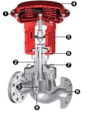 调节阀按其能源方式不同主要分为气动调节阀、电动调节阀、液动调节阀三大类。它们的差别在于所配的执行机构上。前者配的是气动执行机构,中间一种配的是电动执行机构,后者配的是液动执行机构。 气动调节阀剖面结构图1-膜片,2-上阀盖,3-阀芯,4-膜盖,5-执行机构 6-阀杆,7-填料,8-阀体,9-阀座