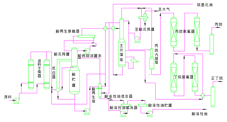 酸耗在烷基化的操作成本中占的很大比重。原料中的水和二烯烃都会使酸耗增加。因此原须经过脱水和选择加氢