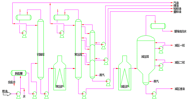 原油蒸馏一般采用三级蒸馏(初馏塔或蒸发塔、常压塔、减压塔),轻馏分少的原油也可只用二级蒸馏(常压塔、减压塔)。