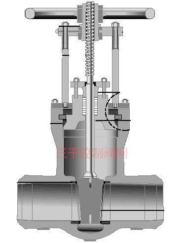 此种结构要装有开闭指示器,以指示开闭程度。这种结构的缺点是:阀杆螺纹不仅无法润滑,而且直接接受介质侵蚀,容易损坏。