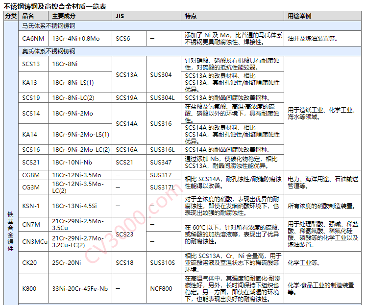 不锈耐酸钢是指用于石化及化工、化肥行业中抗硝酸、硫酸、醋酸及有机酸等耐腐蚀性的铬镍或铬镍钼不锈耐酸钢。不锈耐酸钢铸钢主要是采用ASTM A743或ASTM A744标准中CF8、CF8M、CF3、CF3M、CF8C、CD-4MCu和CN7M等,其对应的轧材分别为ASTM A182标准中的F304、F316、F304L、F316L、F347、F53及美国UNS N08020。
