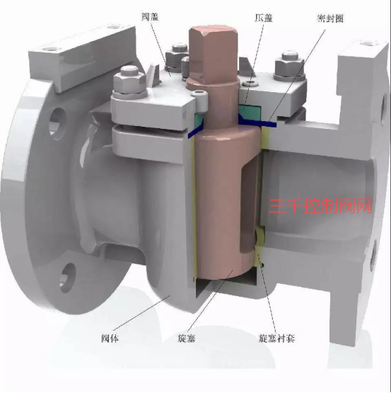 2、压力平衡式旋塞阀为了减少常规硬密封旋塞阀的力矩,常采用压力平衡式旋塞阀。压力平衡式旋塞阀除具有常规油润滑旋塞阀的特点外,还有下列特点:压力平衡式旋塞阀的旋塞锥体的安装方式为倒装。旋塞锥体的上部有一止回阀。在阀门关闭时,由于旋塞锥体上下截面积差,注入的高压密封油使塞体受到向上的提升力,使塞体和阀门的密封面能更好的密封。在阀门开启瞬间,阀体下腔的压力与管道的介质压力平衡,上腔的高压密封油使塞体受到向下的推力,而使旋塞锥体与阀体密封面间出现微小间隙,旋转塞体时的力矩将有效减少。也可保护密封副。在高温工况下,旋塞的热膨胀可通过其升降来吸收,避免密封副楔死。油润滑硬密封旋塞阀,虽然采用油润滑能适当减少启闭力矩,但却可能对介质形成污染。因此针对实际工况选择密封润滑油。 提升式旋塞阀 提升式旋塞阀有多种结构形式,提升式旋塞阀按密封面的材料分为软密封和硬密封两种。其基本原理时为开启时使旋塞上升,旋塞再转动 90 度到阀门全开过程能减少与阀体密封面的摩擦力;关闭阀门时使旋塞转动 90 度至关闭位置后再下降与阀体密封面接触达到密封。