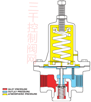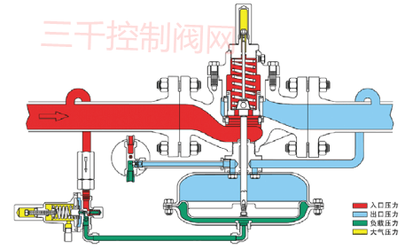 阀前压力调节是调节阀前压力,又称泄压阀,取压点在阀前,阀后压力调节取压点在阀后,又称减压阀。压差自力式阀门,用于控制与其串联的某一设备或某一回路的进出口压差恒定。当被控对象的压差大于设定值时,阀门关小,当被控对象的压差小于设定值时,阀门开大。阀门本身的压降随外网的资用压头的变化而变化,以保证被控对象的压差恒定。